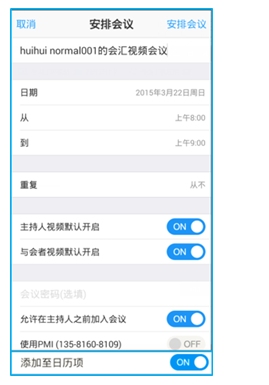 l 添加日历:开启后手机的日历项会按时弹出会议提醒。
