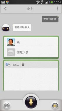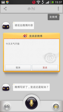发微薄或微信不愿意打字怎么办?那就交给小hi吧,直接语音告诉小hi微博的内容,小hi便会自动转换成文字发布。或者想发微信给某个人,同样可以直接告诉小hi,让小hi帮你处理。