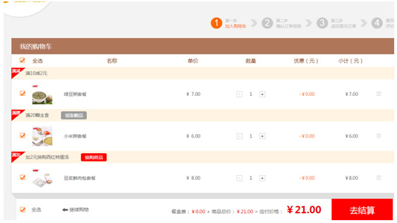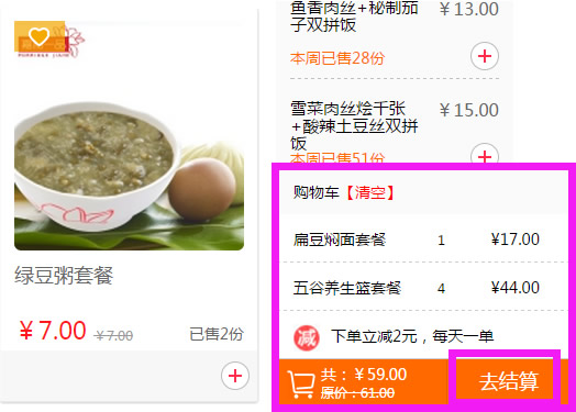 1、选择餐品类别—选择商家-选择喜欢餐品-加入购物车-选择商品数量,如下图: