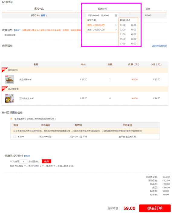 3、用户核对商品信息无误后,点击【去结算】,跳至订单确认页面,选择配送方式---选择配送时间---核对订单信息---提交订单。如下图: