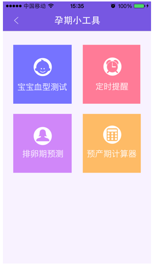 4、“孕期小工具”功能:宝宝血型测试、定时提醒、排卵期预测、预产期计算器等小功能,为孕妈的孕期生活提供贴心周到的服务。