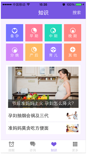 3、“知识”功能:5000余个经过权威顾问专家提炼的知识点,根据孕妈妈需求进行合理分类,(包括:备孕、早期、中期、晚期、分娩、产后、育儿)例如:备孕阶段,我们为孕妈提供了遗传优生、身心调整、孕前检查、怀孕禁忌、饮食调理、生男生女六个部分。知识库还可以智能搜索,最大限度的方便孕妈妈使用,为迎接新生命的到来,保驾护航。