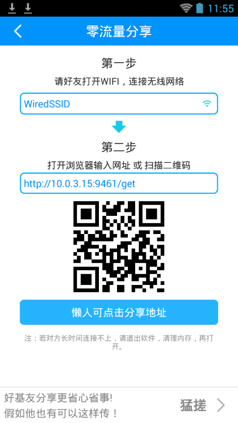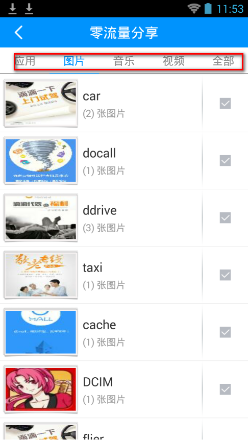 图片、视频、音乐、联系人、已安装应用以及SD卡中的任意文件分享。