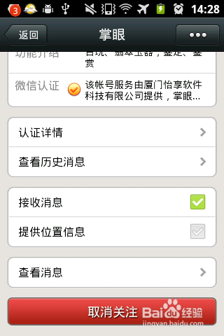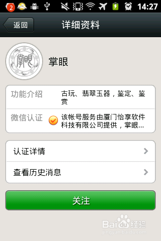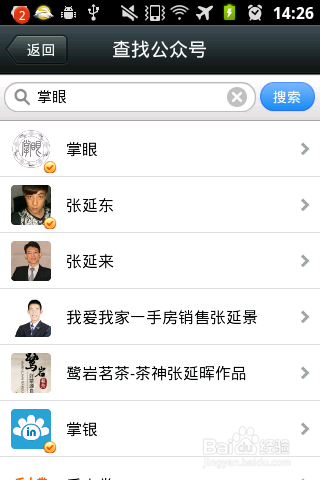 在公众号查找输入框中输入“掌眼”。即可看到“掌眼”微信认证公众号