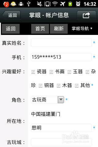 未注册的用户,点击任意功能模块,都将进入如下图所示的注册界面,只需在上面提交完必填消息,如姓名、联系电话等信息,即可完成掌眼的注册,注册完成后,即可进行古玩交易、藏品发布、鉴定等操作。