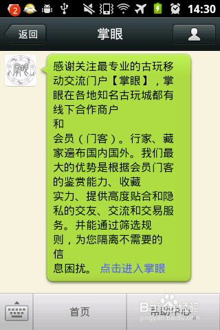 进入掌眼界面后,我们可点击底部“首页”按钮,或者点“点击进入掌眼”字眼来进入掌眼古玩平台首页