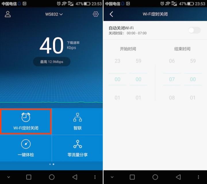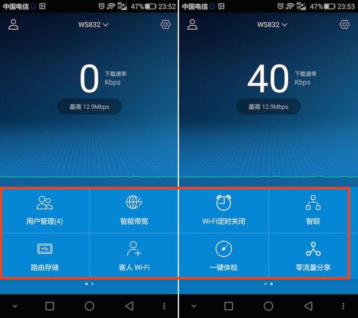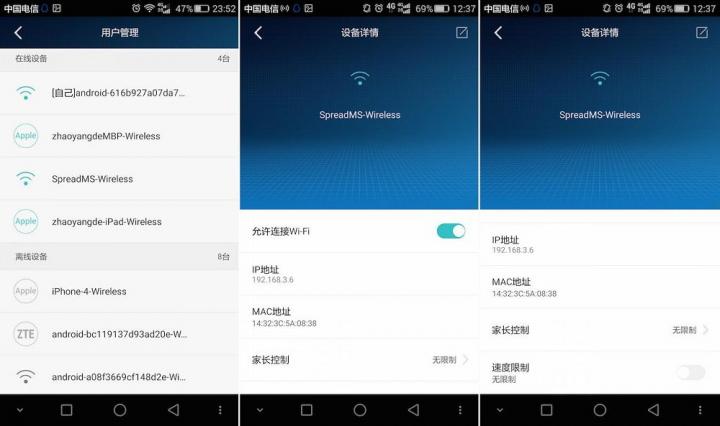 APP有“用户管理、智能宽带、路由存储、客人Wi-Fi、Wi-Fi定时关闭、智联、一键体检和零流量分享”的八大特色功能。其中,大家最关注的莫过于防止蹭网-用户管理。