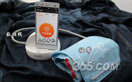 安装好iHealth APP后,接下来我们需要将小米iHealth智能云血压计的“袖带”、云血压计、数据线、小米手机连接起来使用。连接方法非常简单,将数据线将“袖带”和“云血压计”连接起来,而小米手机则放置在“小米iHealth智能云血压计”的USB接口上,如下图所示。