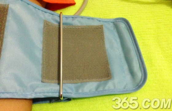 接下来就是打开袖带,袖带卷在手的肘关节上侧1—2cm处,人平躺着,袖带要与心脏要保持在同一水平位置,当然,也可以坐着测试,如下图所示: