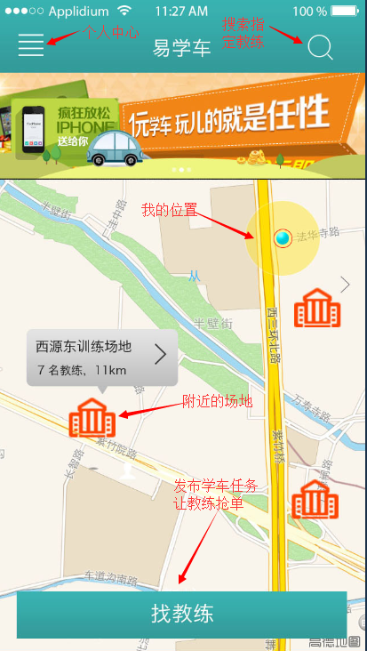 2、完成注册并登陆后,进入首页你会看到一张类似于uber、滴滴等首页的地图模样,你可以在这张地图上看到你自己的位置以及附近的教练场地。