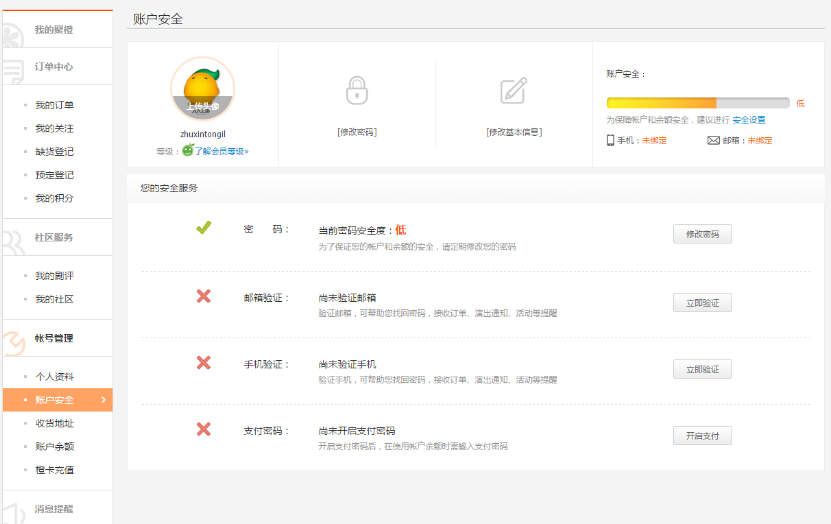 第一步:点击页面顶部“我的聚橙”,进入“帐户中心—帐户安全”页面;