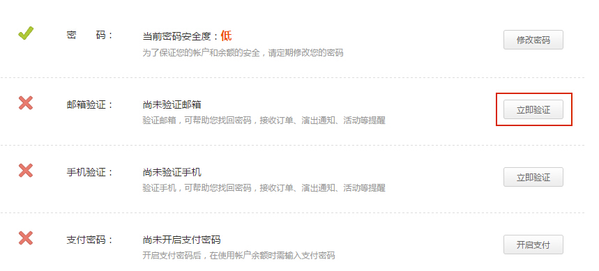 第二步:在验证邮箱栏,点击“立即验证”按钮,进入绑定邮箱页面;