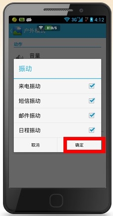 最后我们在来点击震动,把你要设置动作的复选框选中,然后点击确定就可以了