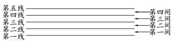 五线谱的五线从下往上的名字为下图(线与线之间的间隔称为[间]):