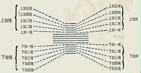 通常在五线谱的上面或下面还可以增加[线]与[间],如下图示意: