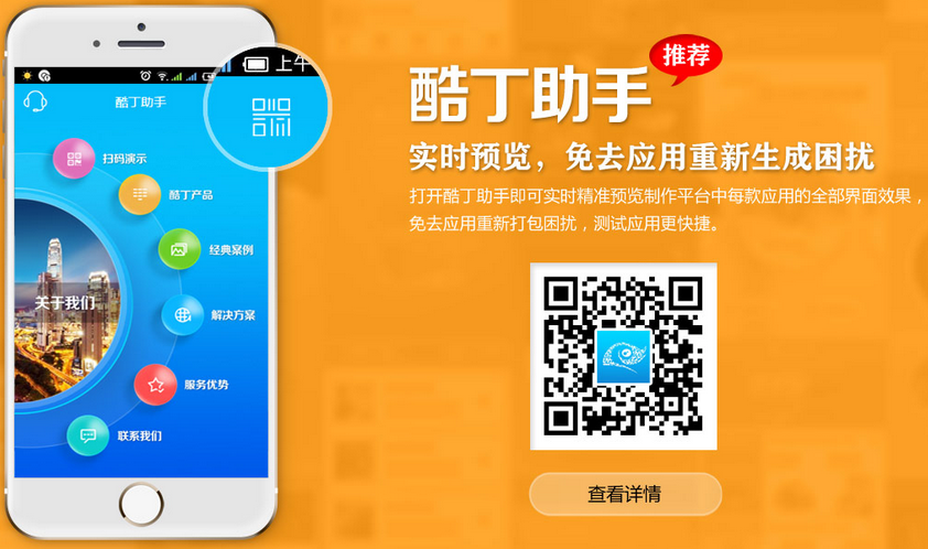 通过酷丁平台独创APP开发助手,简单的扫码就可实现对APP的实时测试和效果预览。