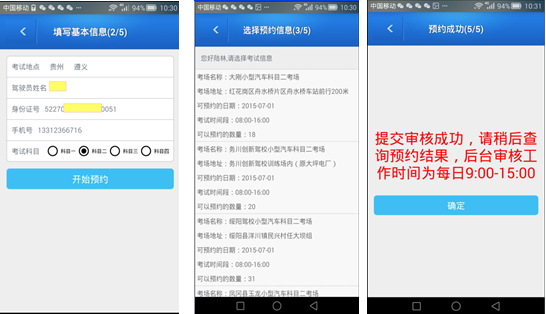 1、填写个人信息:点击进入应用,看到图一界面,点击右下方“设置”项目,点击选择“附加:驾照考试预约”,进入图二界面,仔细阅读说明后,如条件符合,点击图二中驾照考试预约,进入图三界面,在最上方“选择查询预约类型”栏目点击下拉菜单后选择“提交审核”,点击“考试地点”下拉菜单后选择所要考试的市州,并准确填写个人信息,上传本人手持身份证清晰照片,点击确定。