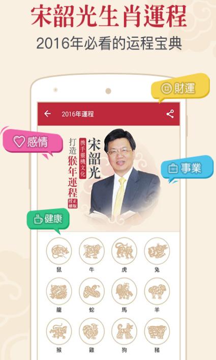 1、2016本命年运势查询手机版APP内有猴年运势指南、生肖运程、司徒法正特色开运方法、好运风水阵、猴年婴儿改名宜忌和择吉通胜六大类