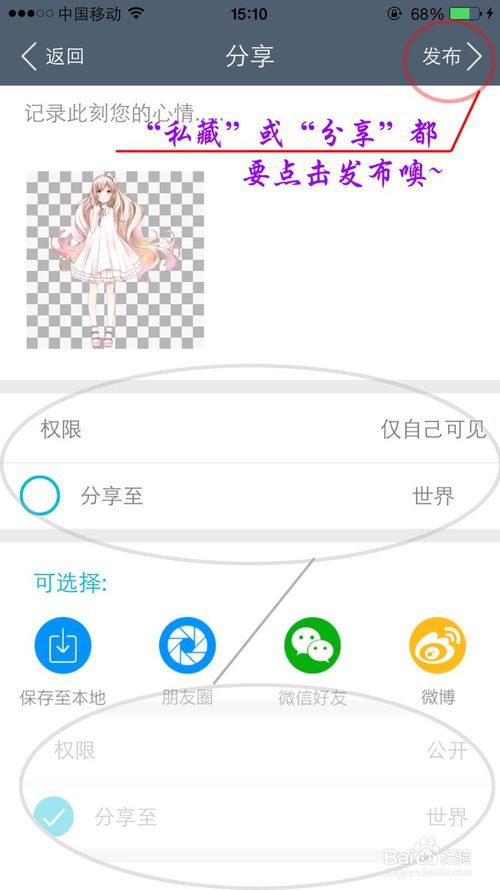 特别注意:仅自己可见或将图片分享至论坛,均需点击【发布】