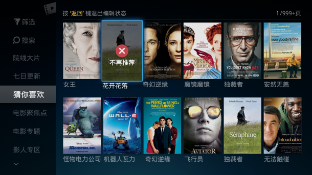 电影频道增加了新的影视推荐功能。在退出观看时,会弹出五部“看过该电影的人还喜欢”的影片供你选择观看。该影视推荐功能基于大数据运算,推荐的精准程度会让你感到惊喜的!