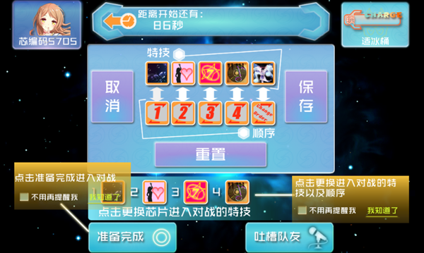 修改好了对战时需要用到的4项特技以及出现的顺序后,点击【保存】。完成这些后就能点击【准备完成】,然后正式的进入新手对战。