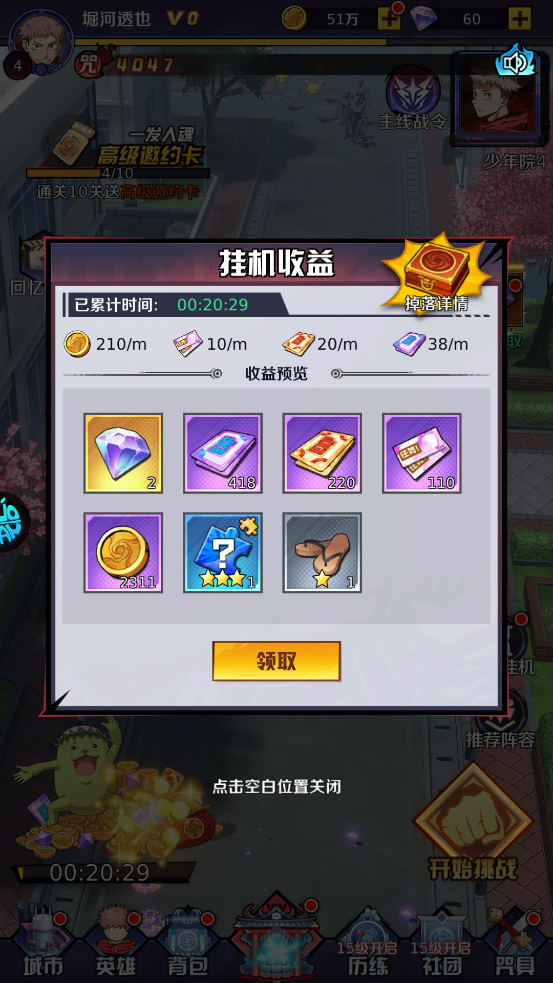 5、玩家进入游戏一段时间后,可领取挂机奖励。