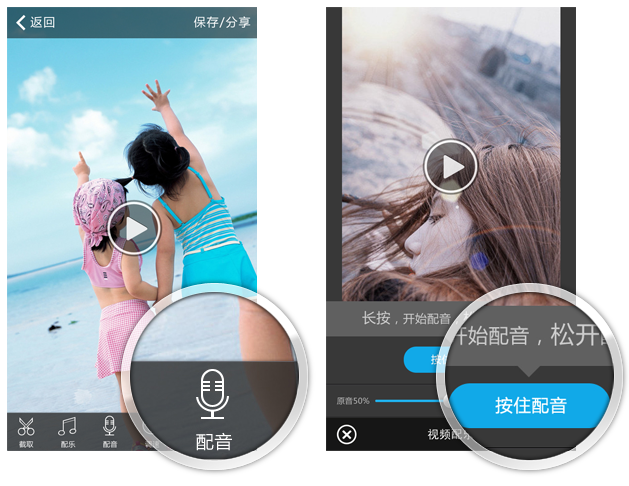 1,长按开始配音或者播放按钮。(如果有耳机,配音时候可以听到原声,效果更好。)2,在需要开始配音的时间点,长按“按住配音”按钮,对着话筒说话配音,说完后松开手指, 完成配音。