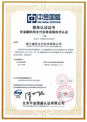 获得中金国盛认证中心安全标准认证。中金国盛认证中心(以下简称“认证中心”)是根据人民银行的决策部署,由中国人民银行直属单位中国金融电子化公司筹建,经国家认证认可监督管理委员会(以下简称国家认监委)批准设立的专业认证机构。盛炬顺利通过中金国盛认证中心安全认证,说明盛炬在支付系统的安全性方面达到了国际要求,拥有了国际水准的安全保证。