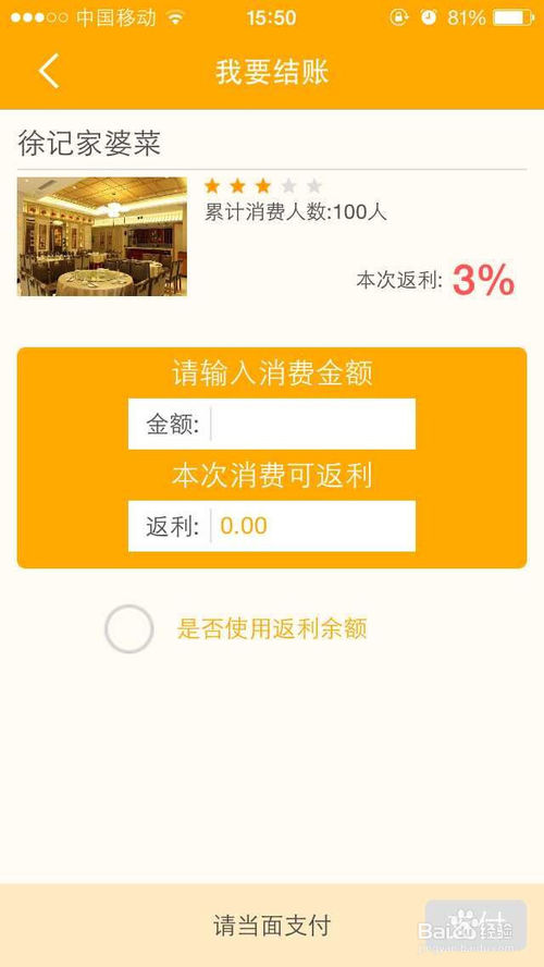 然后根据本次消费多少钱,在金额里填写应付给商家的金额,然后可以选择“是否使用返利金额”,最后点击支付(请当面支付)。