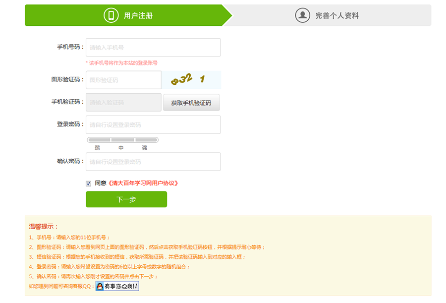 2、转到用户注册界面,请根据提示输入手机号码注册账户;首先输入手机号,图形验证码,然后点击"获取手机验证码",等待手机短信,把接收到的验证码输入到提示框,接着输入登录密码和确认密码(登录密码和确认密码必须一致),然后点击下一步,提示您注册成功;