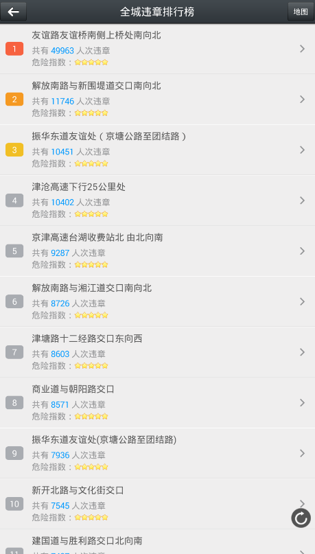 天津汽车违章查询app是一个查询天津市机动车违章信息的工具,并且为您显示最容易违章的路段,以及无违章排行榜,违章最多的排行榜。