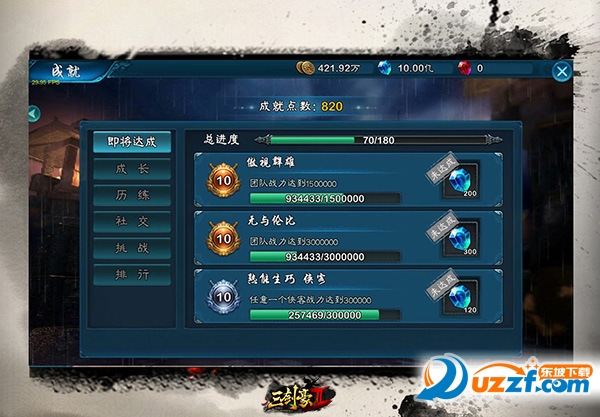 三剑豪2成就系统目前共设有180个成就,分为几种不同类型的大项,包括战力成长、副本进度、挑战与竞技等。每个大类中包含一定数量的目标,只有完成对应目标才可以获得奖励。