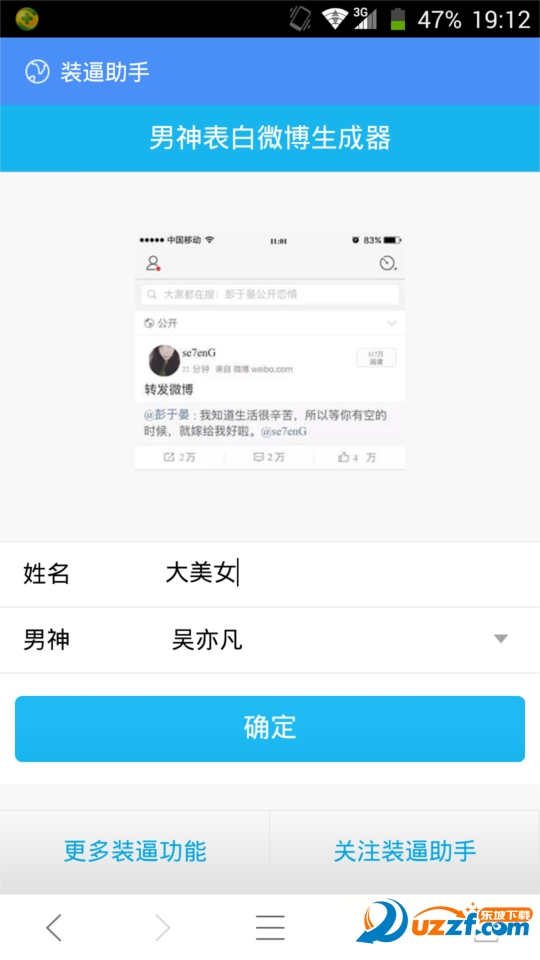 男神微博表白图片生成器是目前非常火非常火的图片生成器中的一种,趁知道的人不多,赶紧玩起来!可以选择吴亦凡,王思聪等等男生,他们在微博发表表白并艾特你的图片,发到朋友圈即刻引爆!疯狂集赞神器!