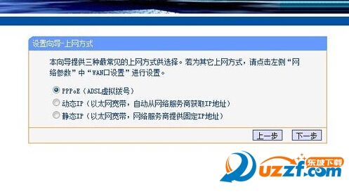 5、点击下一步,进入上网方式设置,我们可以看到有三种上网方式的选择,如果你家是拨号的话那么就用PPPoE。动态IP一般电脑直接插上网络就可以用的,上层有DHCP服务器的。静态IP一般是专线什么的,也可能是小区带宽等,上层没有DHCP服务器的,或想要固定IP的。因为我拨号所以选择pppoe。