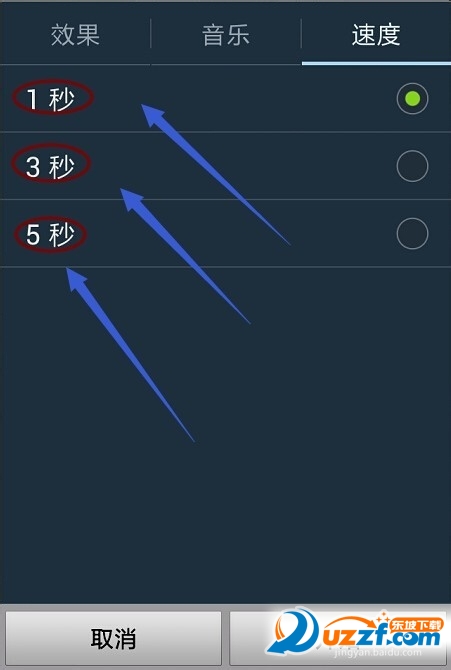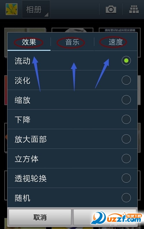 为了更好的让图片的播放效果满足我们的要求,我们很有必要先进行一下播放设定,一共有三种设置,分别是播放效果、音乐以及播放速度,效果就是每张图片以何种方式出现;开启音乐功能以后,在播放照片的时候会伴着背景音乐;播放速度就好理解了,就是每张图片之间的间隔