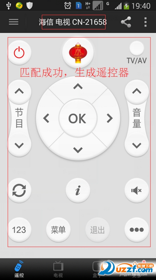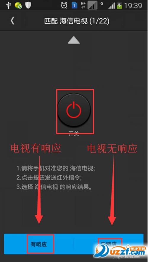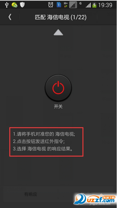 “匹配”界面,按照屏幕提示,用手机对准目标设备点击屏幕按钮,进行测试,设备正确响应后选择“有响应”,反之选择“无响应”。多个按钮测试完成后,就会生成正确匹配设备的遥控器,我们就可以用该遥控器来控制设备了。