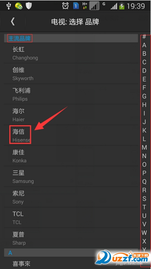 “选择品牌”界面列出所有国内电视品牌,最上方是主流品牌。可通过右侧字母来快速定位电视品牌。我们选择“海信”进入下一步。