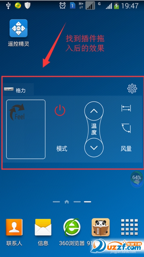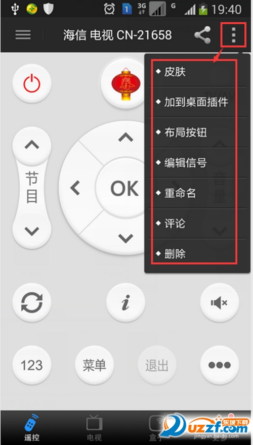 在遥控器界面上,点击右侧按钮即可管理遥控器。可对遥控器的皮肤、按钮位置、按钮信息等信息进行编辑。可以将当前遥控器以组、件形式添加到手机桌面。使用更加便捷。添加方法:选择菜单中添加到插件后,在手机桌面空白处长按即可出现插、件添加选择,然后找到该组件拖放到桌面即可。