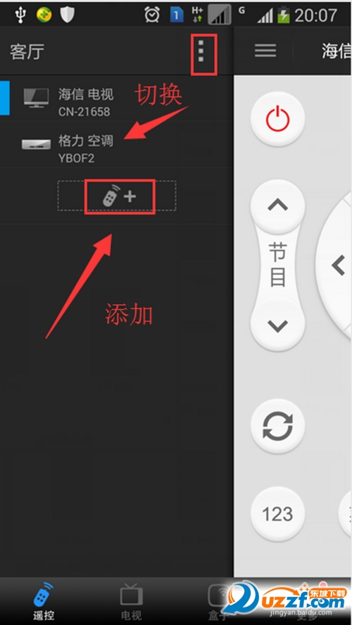 在遥控器界面上,点击左侧按钮,出现遥控器切换/添加菜单,可以直接点击切换到其它遥控器,也可以点击最下面按钮进行添加。点击界面右上角的按钮可进入房间选择界面。
