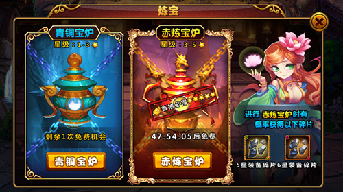 b)赤炼宝炉:有几率得到3-5星装备、4-6星装备碎片、镶嵌宝石、精炼石。每次抽取花费298元宝;每48小时可免费抽取一次;