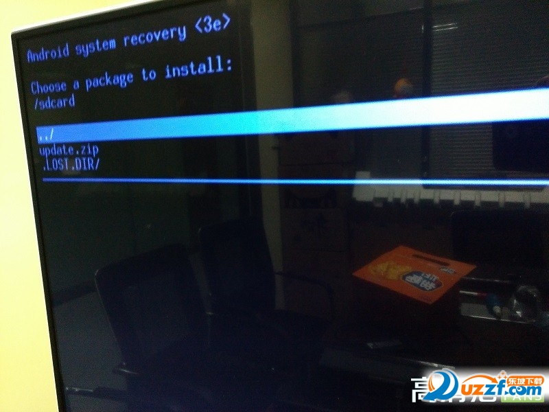 6.看到盒子前部的蓝色电源灯亮起,请迅速取消短接。盒子将进入RECOVERY。选择“apply update from EXT”