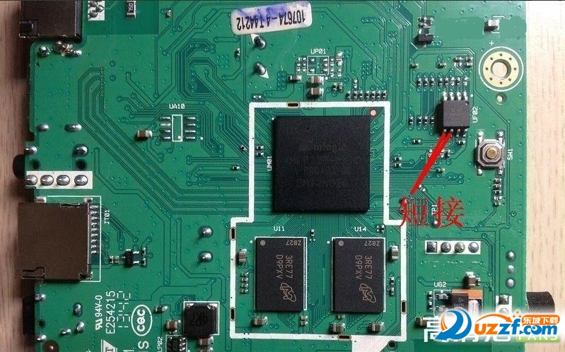 5.将图示位置用金属短路掉,保持短接,给盒子插上电源。天猫魔盒TMB100有3种型号,短路方法各不相同,在盒子底部可看到盒子型号