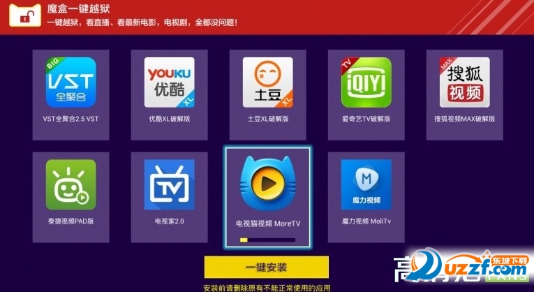 天猫魔盒到手,外观很给力。但是很可惜,天猫魔盒并没有直播点播等功能。我们还得自己摸索一下怎么安装软件,安装什么直播点播软件。这里给大家推荐一个超级简单的软件,魔盒一键越狱。只要安装这个软件,点击一键安装,就可以安装可以观看直播点播的软件。