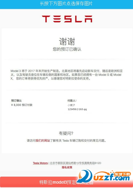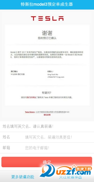 特斯拉model3预定单生成器是一款可以生成特斯拉model3预定单图片的工具,帮你制作装逼图片,分享给好友,装一把土豪,快来下载玩玩吧!