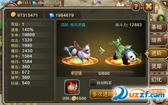 酷炫的坐骑形象快到碗里来!坐骑的进阶是一个积累幸运值的过程,每一次使用一定数量的进阶石,有几率让自己的坐骑进阶到下一阶段。进阶失败则会累加幸运值,幸运值越高,进阶成功的几率越大。坐骑进阶以后不但可以大幅提升属性,还能够激活新的坐骑形象,提高坐骑的移动速度,还在等什么!