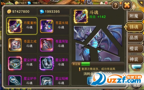 一种提升属性的有趣玩法,花费金币激活魂片,并使魂片成功复原,即可获得大量的属性奖励并且进入下一铸魂阶段。