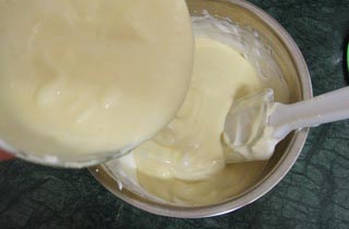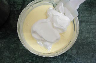 8.取出冷藏的蛋黄奶酪糊,用刮刀取三分之一打发好的蛋白到里面
