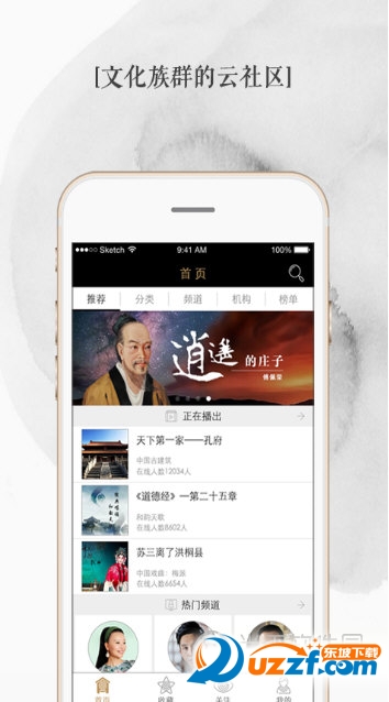 平台内容包括儒家、道家、佛家、国学、养生、中医、艺术、文学、生活、民族、公益、红色文化等,用户通过平台可以观看海量传统文化主题的视频;可以通过提问、评论等功能参与大型国学活动的直播,与名家即时互动。