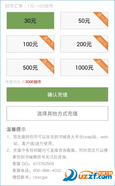 3、任意选择一种充值方式,即可看到有30元、50元、100元、200元、500元、1000元的充值,用户选择你想要充的金额,然后确认充值后进行付款即可。