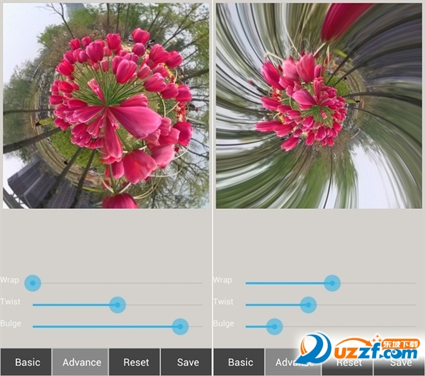 为了让图片更加完美,可以点击“Advance”对图片进行进一步的调整。在这里只有三个选项,Wrap负责调整图片中心到球形图片边缘的距离;Twist用来调整图片的扭曲度,给人一种图片被拧的感觉;Bulge主要负责图片中心的隆起幅度的调整。